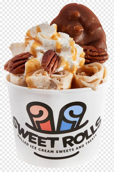Download this high-quality, transparent PNG image of a delicious Sweet Rolls ice cream! Featuring a cup overflowing with rolled ice cream, pecans, whipped cream, and a chocolate-covered strawberry, it's perfect for food blogs, menus, social media graphics, or any dessert-themed project. Get this free PNG now and add a sweet touch to your designs! No attribution required.