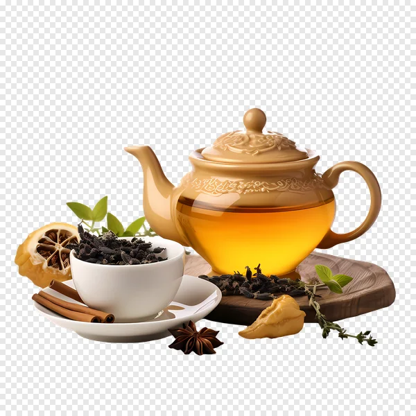 Download this beautiful, high-quality tea time still life PNG image for free! Featuring a golden teapot, delicate teacup, black tea leaves, cinnamon sticks, star anise, lemon slices, and fresh mint, this image is perfect for blogs, websites, invitations, or any project needing a warm and inviting aesthetic. Use it to represent relaxation, comfort, or a cozy atmosphere. Transparent background for easy integration. Get your free download now!