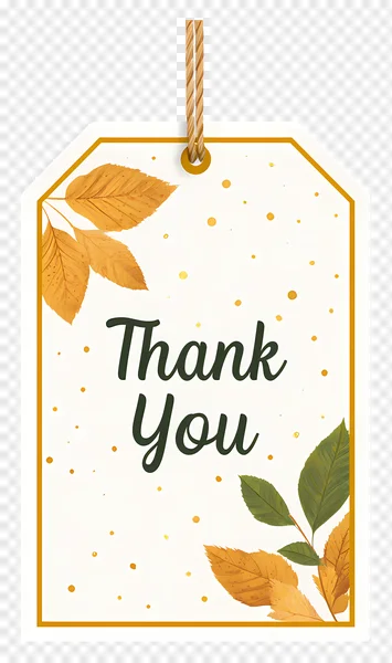 Download this beautiful 'Thank You' tag PNG for free and add a touch of heartfelt gratitude to your projects! This elegant design features charming autumn leaves in shades of golden orange and green, scattered golden speckles, and a realistic rustic twine string at the top, all framed by a sophisticated golden border. Perfect for digital scrapbooking, gift tags, thank-you cards, wedding favors, party invitations, business packaging, or any creative design needing an appreciative fall or general appreciation theme. Its high-quality, transparent background makes it easy to integrate into your designs. Get your free 'Thank You' label today and express your appreciation with style!