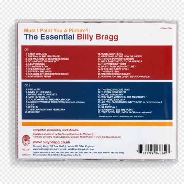 Download the high-quality PNG image of 'Must I Paint You A Picture?: The Essential Billy Bragg' CD back cover for free. This iconic compilation album features a detailed tracklist for both CD1 and CD2, including hits like 'A New England', 'Sexuality', and 'Levi Stubbs' Tears'. Perfect for music fans, graphic designers, or anyone needing vintage album art for their projects. Explore the classic red, blue, and white design, production credits, and barcode details. A must-have for Billy Bragg enthusiasts and collectors of British folk-punk. Get your free transparent PNG download today!