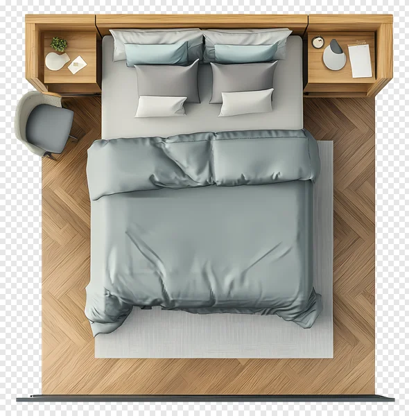Download this stunning top-down view PNG image of a modern bedroom. Perfect for interior design presentations, website banners, or home decor blogs. Featuring a stylish bed with gray bedding, wooden floors, integrated nightstands, and a minimalist aesthetic. High-resolution, transparent background for easy integration into your projects. Download now and elevate your designs!