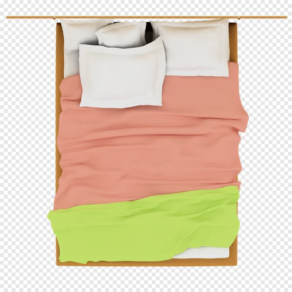Download this high-quality, free PNG image of a bed viewed from above. Perfect for interior design projects, website mockups, or presentations. The image features a coral duvet, lime green throw, and crisp white pillows on a light brown bed frame. This clean, minimalist style makes it easily adaptable to various design schemes. Download now and enhance your projects!