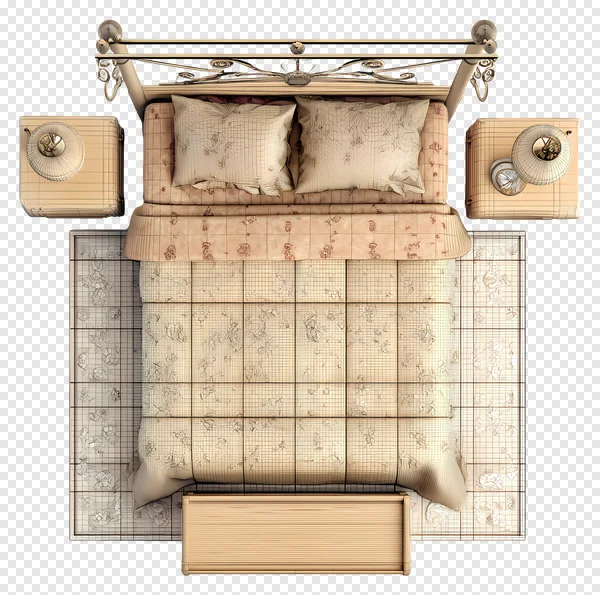 Download this stunning high-resolution PNG image of a beige bedroom scene. The top-down perspective showcases a luxurious bed with ornate headboard, matching nightstands with lamps, and a patterned rug. Perfect for interior design projects, presentations, or website mockups. This detailed image is royalty-free and instantly downloadable. Enhance your designs with this elegant and versatile asset today! Download now and add a touch of sophisticated style to your projects!