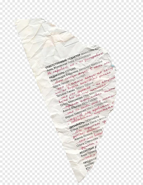 Enhance your designs with this unique free PNG of a torn and crumpled piece of paper, featuring a mix of Russian and English text, including names and editorial roles, some highlighted in vibrant red handwritten script. Its distressed edges and visible creases offer an authentic vintage or grunge aesthetic. Perfect as a versatile graphic element, overlay, or background for scrapbooking, digital art, social media posts, and creative projects. Download this high-quality, transparent paper texture for a distinctive touch to your visual content, adding a layer of authenticity and intrigue.