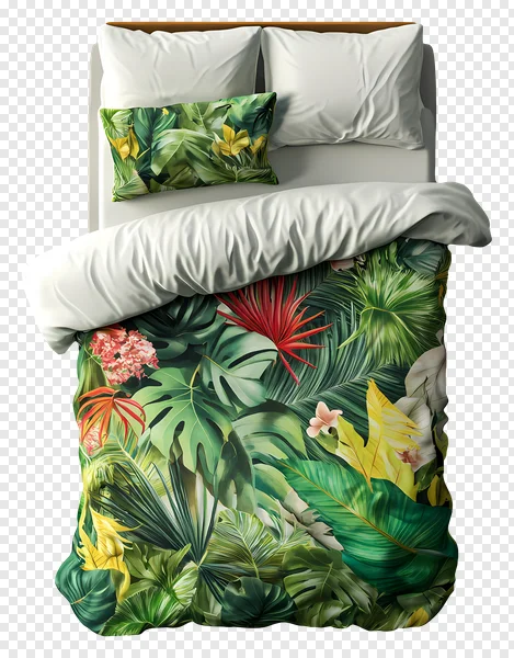 Download this stunning high-resolution PNG image of tropical bedding featuring vibrant green leaves, red and pink flowers, and a lush botanical design. Perfect for website banners, design projects, or creating your own unique patterns. The image showcases a duvet cover, pillowcases, and a decorative pillow, all with the same beautiful print. Instantly enhance your designs with this free, high-quality download. Download now and add a touch of paradise to your creations!