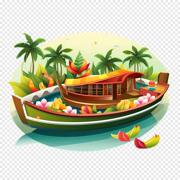 Escape to paradise with this stunning tropical houseboat illustration! Perfect for travel blogs, vacation designs, or adding a touch of exotic flair to your projects. Download this high-quality Kerala backwaters PNG image for free and use it in your personal or commercial work. Featuring a beautifully detailed houseboat surrounded by lush palm trees and vibrant flowers, this PNG is ideal for creating captivating visuals. Get your free download now!
