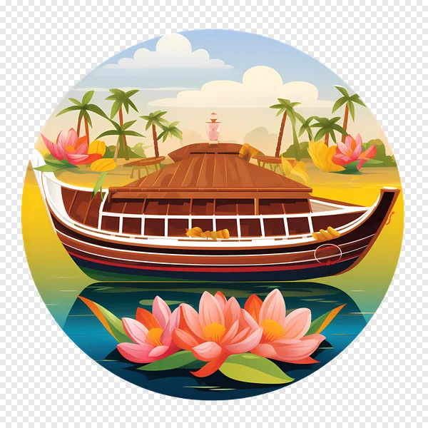 Download this beautiful, high-quality houseboat PNG image for free! Featuring a traditional Kerala-style houseboat floating on tranquil backwaters, surrounded by lush palm trees and vibrant lotus flowers. Perfect for travel blogs, website backgrounds, illustrations, or any project needing a touch of tropical paradise. Transparent background for easy integration. Get your free download now!