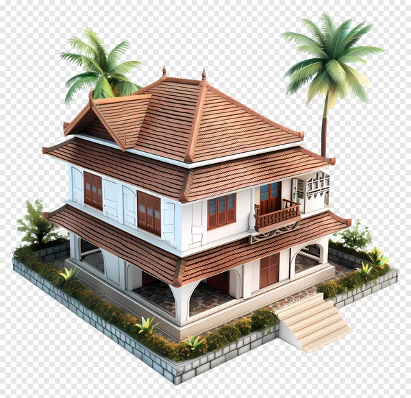 Discover our exquisite free PNG of a tropical two-story villa, showcasing stunning traditional Asian architecture. This detailed rendering features a grand house with a multi-tiered tiled roof, ornate balcony, and rich wooden shutters, flanked by lush palm trees and vibrant garden landscaping. Perfect for architectural visualizations, travel brochures, game design, or adding an exotic touch to any digital project. Download this high-quality image with a transparent background now to bring a touch of paradise and authentic Southeast Asian charm to your designs!