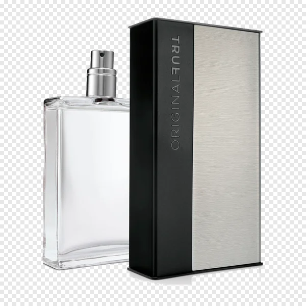 Download this stunning, high-resolution PNG image of a TRUE ORIGINAL perfume bottle and its elegant packaging for free. This isolated product shot features a sleek clear glass fragrance bottle with a modern silver sprayer, perfectly paired with a sophisticated black box showcasing a distinctive brushed metallic front panel. Ideal for e-commerce, advertising campaigns, blog posts, graphic design projects, or any beauty and cosmetic content. Enhance your digital visuals with this pristine image, perfect for showcasing luxury fragrances. Get your free PNG download today!