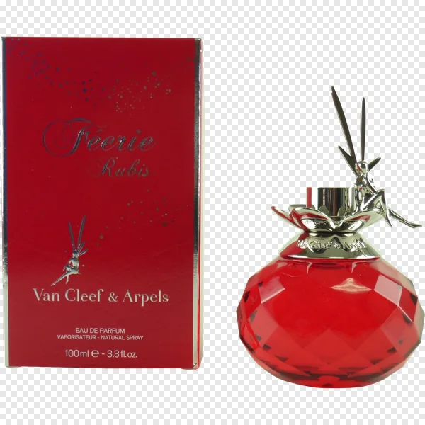 Download this stunning, high-quality PNG of the iconic Van Cleef & Arpels Féerie Rubis perfume. This luxurious Eau de Parfum features a captivating, faceted red bottle adorned with an elegant silver fairy figure on its stopper, presented alongside its matching vibrant red box. Ideal for beauty blogs, e-commerce stores, graphic design projects, or adding a touch of enchantment and opulence to your visual content. Get this transparent background image for free and elevate your creative work instantly!
