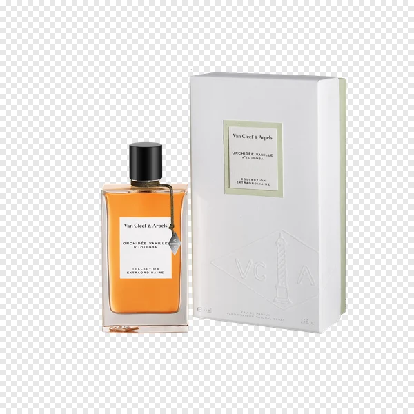 Download this exquisite high-resolution PNG image of the Van Cleef & Arpels Orchidée Vanille Eau de Parfum. This free image features the elegant amber-toned fragrance bottle with its iconic VCA charm and the sophisticated textured white box, highlighting the 'Collection Extraordinaire' line. Perfect for beauty blogs, e-commerce product listings, luxury lifestyle content, mood boards, or any creative project needing a premium perfume graphic. Enhance your designs with this beautiful and detailed luxury fragrance asset today!
