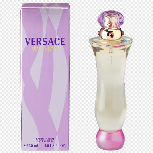 Download this stunning, high-resolution PNG image of Versace Woman Eau de Parfum, featuring both the elegant fragrance bottle and its distinct purple and white striped box. The luxurious perfume bottle boasts a unique, curvaceous shape with a vibrant pink base, a clear glass body, and a sparkling faceted crystal cap adorned with subtle gold accents. Perfect for beauty blogs, e-commerce product listings, graphic design projects, presentations, or digital art. This transparent background PNG offers versatility and professional quality for all your creative needs. Get your free download today and add a touch of sophistication to your visuals!