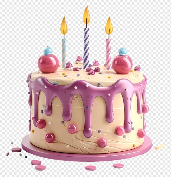 Celebrate in style with this adorable 3D rendered birthday cake PNG! Featuring a creamy pale yellow cake adorned with vibrant purple (magenta) dripping icing, glossy pink decorative spheres, and a scatter of colorful sprinkles. Three beautifully lit candles with blue, purple, and pink stripes add a festive and warm glow. Perfect for birthday invitations, digital cards, party decorations, social media graphics, websites, and any creative project needing a touch of sweet celebration. Download this high-quality, transparent background image for free and add a delightful element to your designs!