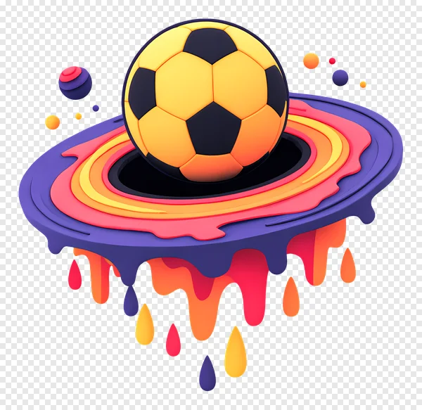 Download this eye-catching free PNG image featuring a vibrant 3D soccer ball resting atop a fantastical abstract structure of colorful, dripping rings. This unique digital art piece showcases a dynamic yellow and dark blue football surrounded by concentric layers of purple, pink, orange, and yellow that appear to be melting and splashing downwards, accompanied by floating satellite spheres. Perfect for adding a playful, modern, or energetic touch to your sports-themed designs, creative projects, website banners, social media posts, or presentations. The transparent background ensures seamless integration into any design. Get this high-quality, free-to-download graphic and elevate your visual content today!