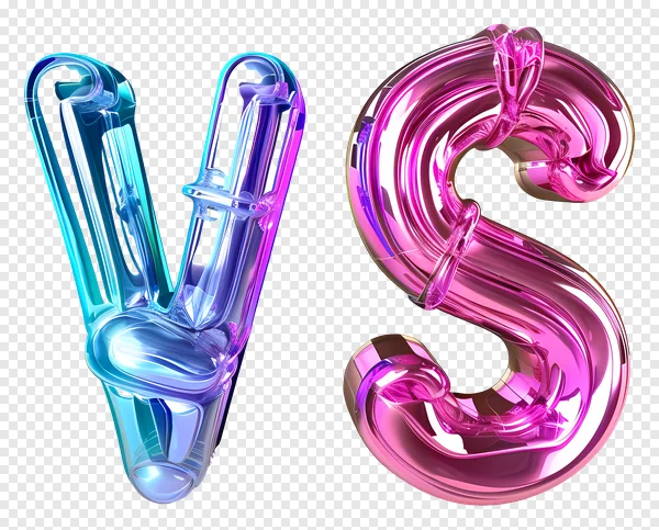 Download this stunning free 'VS' (Versus) letters PNG, featuring a captivating 3D glossy render. The 'V' shines in vibrant blue and teal gradients, contrasting with the 'S' in rich pink and magenta. Ideal for comparison graphics, competitive designs, gaming, sports, or any project needing a modern, eye-catching 'VS' symbol. Isolated on a transparent background, this high-resolution image is ready to enhance your creative work. Get your free download for dynamic visual impact!