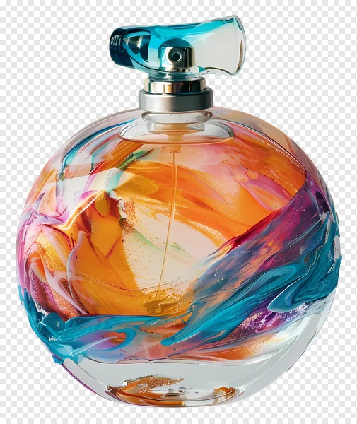 Discover and download this stunning free PNG of a vibrant abstract art perfume bottle. This spherical glass bottle features a mesmerizing swirl of orange, blue, pink, and purple hues, resembling fluid paint within. The elegant design, complete with a metallic silver sprayer and clear blue cap, is perfect for adding a touch of luxury and creativity to your graphic design projects, marketing materials, or personal creations. Get this high-quality transparent PNG today and elevate your visuals with a unique, artistic flair, ideal for beauty, fashion, and product branding.