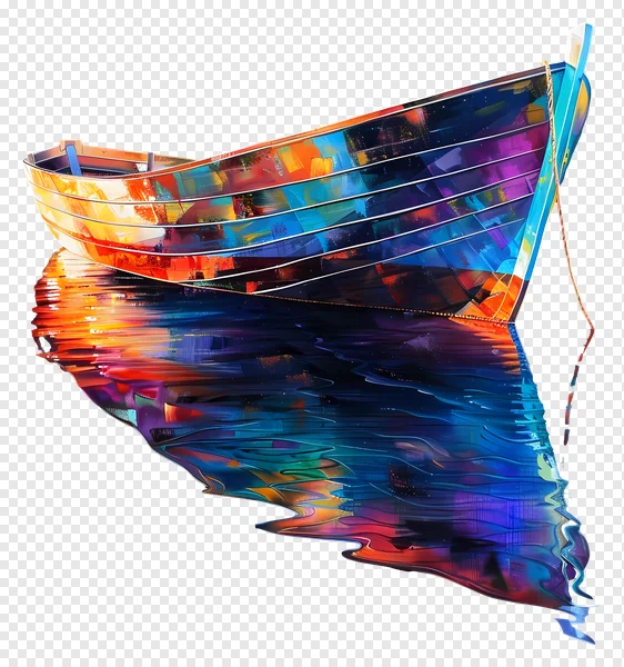 Dive into a splash of color with this stunning free PNG image of a vibrant, abstract boat. Featuring a dazzling spectrum of red, orange, blue, and purple hues, the artistic boat creates a mesmerizing, mirrored reflection on the water against a striking black background. This unique digital painting, with its painterly strokes and rich tones, is perfect for creative projects, web design, presentations, or adding an artistic touch to any digital canvas. Download this high-quality, transparent PNG for free and infuse your designs with a unique, colorful, and nautical flair today!