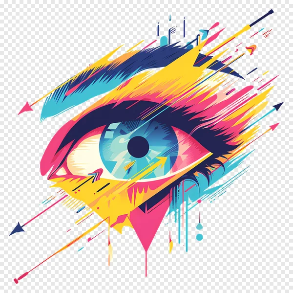 Dive into a world of color with this stunning Abstract Eye PNG, featuring a mesmerizing blue eye encompassed by a burst of dynamic splashes, bold brush strokes, and energetic arrows in yellow, pink, and cyan. This high-quality, transparent PNG image is perfect for adding a modern, creative, and eye-catching element to any project. Whether for graphic design, website backgrounds, social media graphics, presentations, or digital art, this vibrant illustration embodies insight and artistic flair. Download for free and infuse your designs with a powerful visual statement that captures attention.