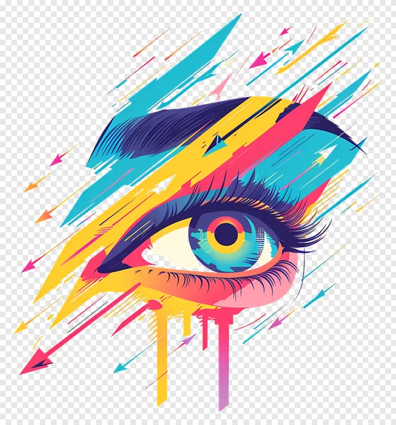 Dive into the captivating world of this vibrant abstract eye PNG. Featuring a striking design with an intricate, almost futuristic iris, long dramatic eyelashes, and an explosion of neon pink, electric blue, and brilliant yellow brushstrokes, this digital artwork commands attention. The dynamic arrow-like elements and colorful drips create a powerful sense of motion and modern artistry, perfect for futuristic and expressive themes. Ideal for website banners, graphic design projects, social media posts, apparel design, or unique backgrounds. Download this high-quality, free transparent PNG and add an electrifying touch to your creative endeavors!