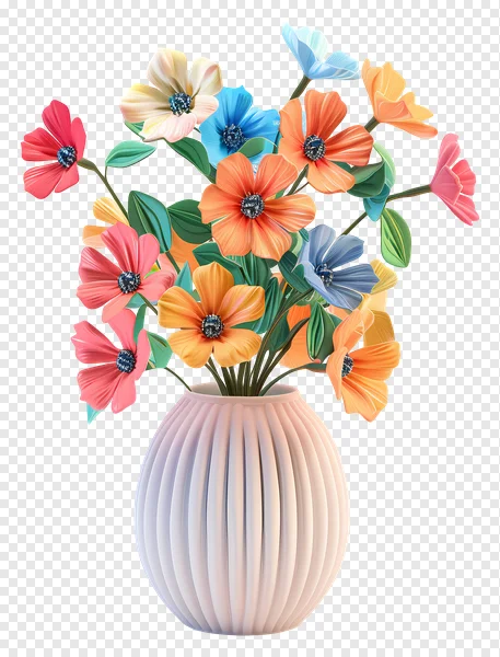 Brighten your designs with this stunning free PNG of a vibrant abstract flower bouquet. Featuring a beautiful assortment of pink, orange, blue, and cream-colored flowers with lush green leaves, all elegantly arranged in a chic, ribbed pastel vase. This high-quality digital illustration, perfect for a transparent background, adds a touch of modern sophistication to any project. Download this eye-catching floral art for free and enhance your website, social media, invitations, or personal crafts with its cheerful and artistic charm. Ideal for designers and creatives seeking unique flower imagery.