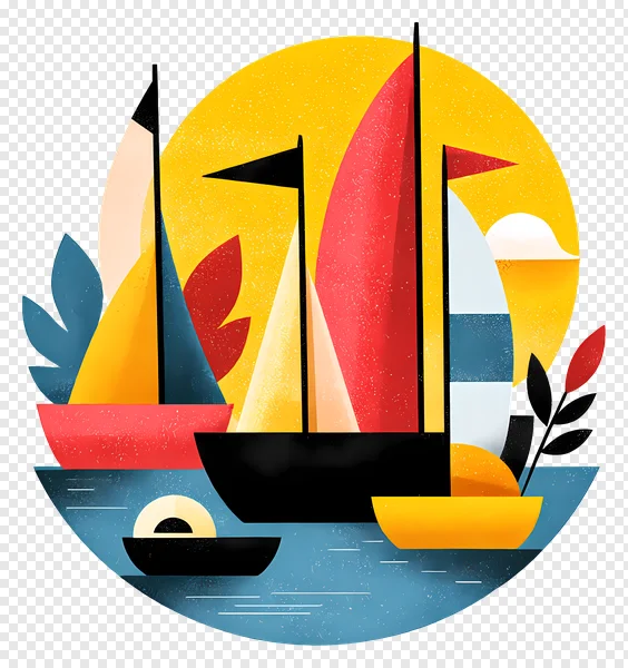 Download our captivating free PNG featuring a vibrant abstract illustration of sailboats. This modern nautical art showcases three distinct boats – with red, yellow, and white sails – navigating peaceful blue waters, all set against a stunning golden sun. The unique textured effect adds depth to the geometric shapes, creating a contemporary and artistic aesthetic. Perfect for graphic design, web projects, social media, or any creative endeavor needing a touch of summer, travel, or serene marine beauty. Get this high-quality, colorful sailboat PNG for free and elevate your designs!