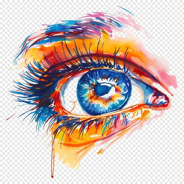 Download this captivating free PNG of a vibrant abstract eye, rendered in an expressive watercolor and paint splash technique. This artistic illustration features a brilliant blue iris surrounded by a kaleidoscope of oranges, yellows, pinks, and purples against a stark black background, making its colors truly pop. Perfect for adding artistic flair to your graphic design projects, website banners, social media posts, presentations, or print materials. This high-quality, transparent image offers a burst of creativity and emotional depth. Get your free download now and infuse your visuals with this unique, colorful vision!