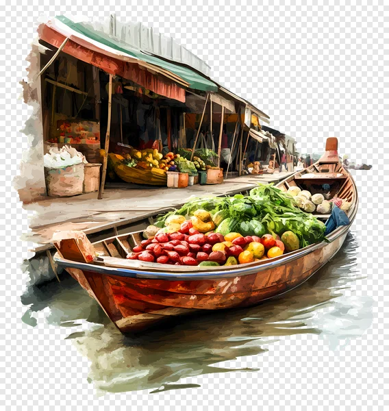 Immerse yourself in the bustling charm of an Asian floating market with this stunning free PNG image. Featuring a traditional wooden boat overflowing with a vibrant bounty of fresh fruits and vegetables like juicy red tomatoes, sunny yellow mangoes, and lush green leafy produce, alongside rustic market stalls. The unique watercolor-style illustration on a transparent background makes it perfect for digital projects, graphic design, travel blogs, educational materials, or presentations. Download this high-quality, SEO-friendly market scene PNG to add an authentic touch of Southeast Asian culture and color to your creative work today!