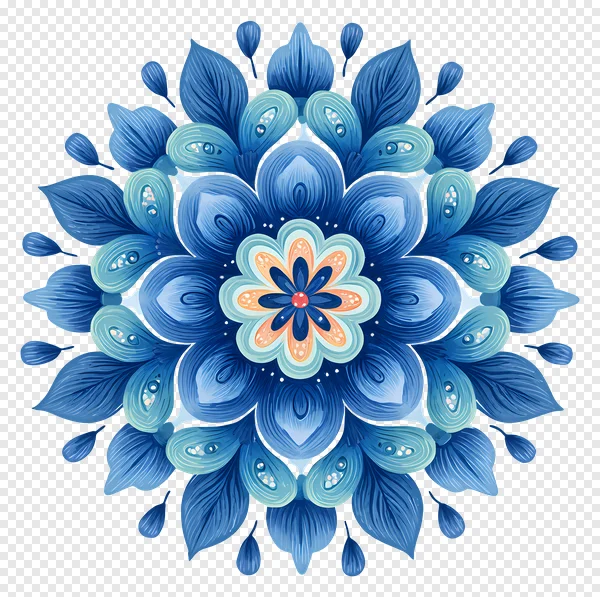 Discover this captivating blue floral mandala PNG, perfect for adding a touch of elegance and artistic flair to your projects. Featuring a stunning intricate design with layered petals in various shades of vibrant blue, teal, and a soft peach-orange center, this digital painting is an exquisite decorative element. Its abstract, symmetrical pattern evokes a sense of calm and beauty. Ideal for graphic designers, artists, and hobbyists alike. Download this high-quality, free PNG with a transparent background today to enhance your creative endeavors, from invitations and posters to digital wallpapers and web graphics. Unleash your creativity with this beautiful flower art.