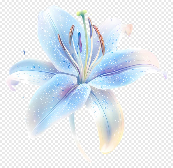 Download this exquisite free PNG of a vibrant blue lily adorned with glistening water drops. This high-quality, transparent image features delicate blue and white petals with subtle hints of purple and yellow, intricate stamens, and a lifelike texture, perfect for adding a touch of elegance to any project. Ideal for graphic designers, web developers, educators, or anyone looking for beautiful floral elements. Use it for presentations, greeting cards, website banners, social media posts, or personal art. Enhance your designs with this stunning, crisp botanical illustration. Get your free transparent lily PNG now for instant impact!