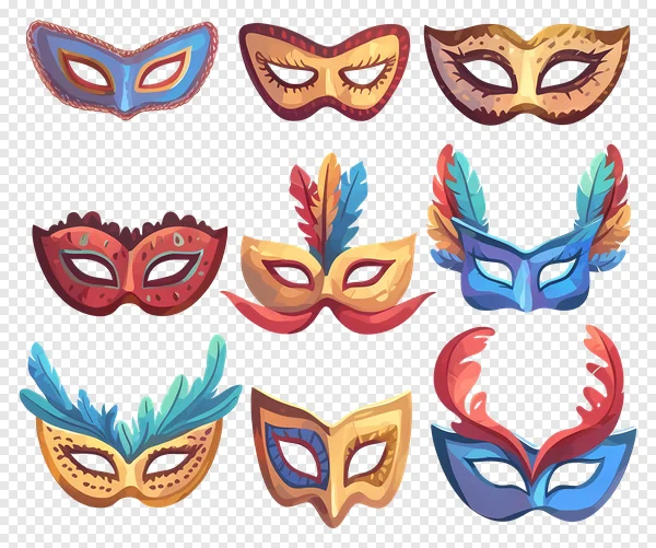 Unleash your creativity with this spectacular collection of nine free PNG carnival and masquerade masks! Each mask boasts a unique design, featuring vibrant colors like blues, reds, golds, and purples, some elegantly adorned with decorative feathers, intricate patterns, and charming details. Perfect for Mardi Gras events, costume party invitations, theatrical designs, festival promotions, or adding a mysterious flair to any digital project. Download these high-quality, transparent images effortlessly to enhance your social media graphics, website banners, posters, and more. A fantastic resource for designers and creators looking for captivating, festive elements. Free for personal and commercial use!