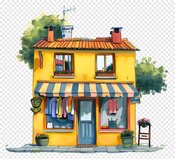 Download this delightful free PNG illustration featuring a charming small shop with a vibrant yellow facade, an orange tiled roof, and a welcoming blue door. The quaint boutique showcases colorful clothing in its window displays under a blue and yellow striped awning, making it a perfect visual for retail themes. Adorned with cheerful window box flowers, lush potted plants, and green trees in the background, this hand-drawn cartoon building is ideal for adding a touch of whimsy and character to your website, presentations, educational materials, or personal design projects. Get this high-quality, transparent image for free!