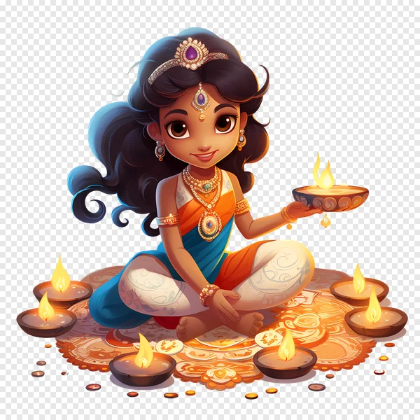 Download this adorable free PNG of a vibrant cartoon Indian girl joyfully celebrating Diwali, the festival of lights! She's beautifully adorned in traditional orange and blue attire with intricate gold jewelry, holding a glowing diya. Surrounded by numerous lit oil lamps on a festive rangoli mat, this illustration captures the spirit of happiness and light. Perfect for creating greeting cards, social media posts, educational content, or adding a touch of cultural charm to your designs. Get this high-quality transparent image instantly!