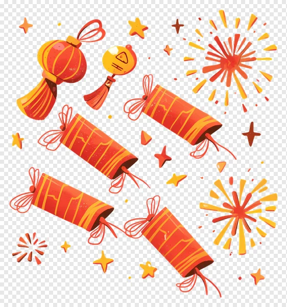 Ignite your designs with this vibrant Chinese New Year celebration PNG, featuring an array of traditional festive elements. This eye-catching illustration showcases bright red firecrackers with golden stripes, charming red and gold lanterns, sparkling stars, and dynamic fireworks bursts, all set against a transparent background for seamless integration into any project. Perfect for Lunar New Year greetings, party invitations, social media posts, cultural event promotions, or adding a touch of oriental flair to your creative works. Download this high-quality, free transparent PNG to bring good luck and festive cheer to your designs!