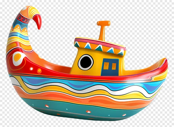 Download this vibrant, multi-colored cartoon boat PNG image for free! This whimsical, stylized ship features a cheerful yellow cabin, a bold red curled bow, and intricate wavy patterns in blue, orange, and white, all on a transparent background. Perfect for children's books, graphic design projects, digital art, educational materials, or adding a playful, decorative touch. Get this unique, high-quality asset for all your creative needs today!