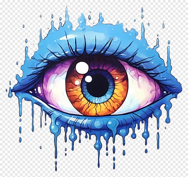 Discover this captivating free PNG of a vibrant dripping eye, perfect for adding a touch of surreal artistry to your projects. This high-resolution image features a mesmerizing multi-colored iris in warm orange, yellow, and cool blue tones, beautifully contrasted with purple eyelids. The striking element is the electric blue liquid effect, appearing to melt or drip from the eye, complete with distinct eyelashes and bold outlines. Ideal for graphic design, t-shirt prints, digital art, social media, album covers, or any creative endeavor seeking a unique, psychedelic, or fantasy aesthetic. Download this transparent PNG for free and infuse your designs with a splash of dynamic, artistic energy.