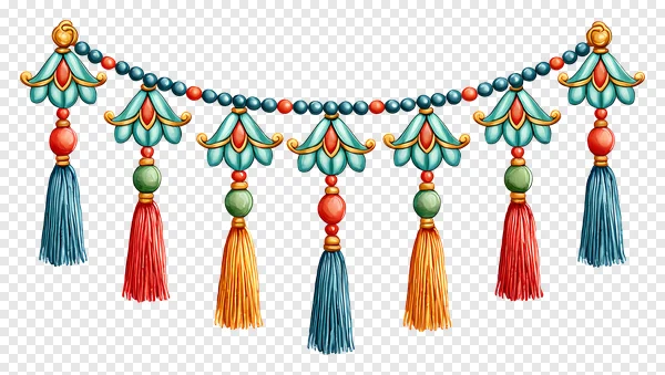 Enhance your creative projects with this stunning free PNG of a vibrant decorative tassel and beaded garland. This eye-catching design features ornate gold and turquoise floral accents, interspersed with colorful red, green, and blue spherical beads. Rich blue, red, and orange tassels hang gracefully, adding a touch of traditional elegance. Perfect for invitations, digital scrapbooking, cultural event designs, website borders, or any graphic design needing an intricate and lively embellishment. Download this high-quality, transparent image for free to infuse your designs with beautiful ethnic-inspired details today!