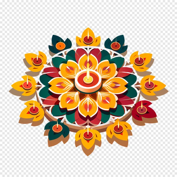 Download this stunning free PNG of a vibrant festive diya mandala, perfect for adding a touch of traditional elegance to your designs. Featuring a colorful arrangement of traditional lamps (diyas) in rich yellows, reds, and deep teal, set in an intricate floral mandala pattern against a transparent background. Ideal for Diwali, Vesak, Purnima, or any cultural celebration, this high-quality graphic is perfect for greeting cards, invitations, social media posts, website banners, and educational projects. Get this beautiful traditional lamp decoration for free and illuminate your creative projects!
