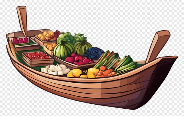 Discover our stunning, free PNG illustration featuring a traditional floating market boat overflowing with a colorful bounty of fresh fruits and vegetables. This high-quality clipart captures the essence of vibrant produce markets, showcasing crisp watermelons, juicy berries, ripe tomatoes, leafy greens, carrots, lemons, garlic, and more. Perfect for recipe blogs, healthy eating campaigns, educational materials, travel-themed designs, or cultural projects. Download this beautiful, transparent background market boat PNG for free today and add a touch of fresh, global flavor to your graphic design, web content, presentations, and more. A versatile asset for food, health, and travel enthusiasts!