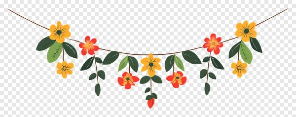 Adorn your projects with this beautiful, free PNG of a vibrant floral garland! Featuring charming yellow and red flowers intertwined with lush green leaves on a sturdy brown string, this decorative banner is perfect for adding a touch of nature and festivity. Ideal for invitations, greeting cards, website headers, social media graphics, party decorations, or any creative design. Download this high-quality, transparent floral illustration instantly and effortlessly enhance your designs with its cheerful and colorful appeal. Get your free botanical clipart today!