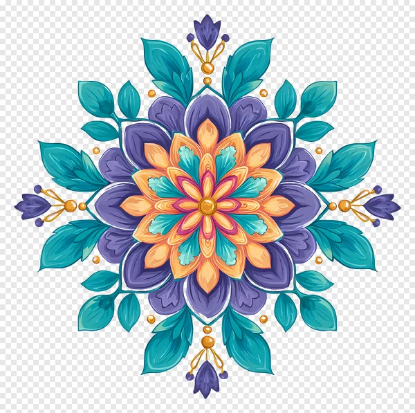 Discover this stunning vibrant floral mandala PNG, a high-quality, intricately designed image perfect for adding a touch of elegance to any project. Featuring beautiful symmetry with petals in rich purple, bright teal, and warm orange hues, accented by delicate golden details, this artwork radiates beauty and harmony. Ideal for graphic designers, crafters, or anyone seeking a unique decorative element, it's perfect for backgrounds, invitations, spiritual art, or digital projects. Download this captivating, colorful, and detailed blossom illustration for free today to elevate your creative work with a symmetrical and artistic flair.