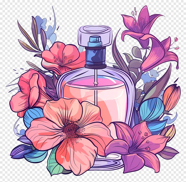 Discover our exquisite, free PNG of a stylish perfume bottle elegantly nestled amidst a lush arrangement of vibrant pink and purple flowers. This captivating illustration features delicate lilies, vibrant poppies, and botanical accents in rich blue and teal hues, all set against a striking black background. Perfect for beauty blogs, fashion websites, social media campaigns, digital art projects, or adding a touch of sophisticated charm to any design. Download this high-quality vector-style fragrance artwork today and infuse your creative endeavors with its luxurious and feminine aesthetic!