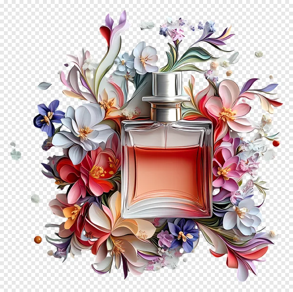 Enhance your projects with this stunning free PNG of a luxurious perfume bottle surrounded by an exquisite array of vibrant, artistic flowers. Featuring a sleek glass bottle with a warm, peachy liquid and a shiny silver cap, set against a dramatic black background, this image exudes elegance and sophistication. The layered, abstract floral design incorporates rich hues of pink, purple, blue, red, orange, and white blossoms, creating a visually captivating composition. Perfect for beauty and fragrance marketing, social media graphics, blog posts, or any creative design that needs a touch of high-end aesthetic. Download this high-quality, transparent background PNG for free today and add a fresh, luxurious feel to your next design endeavor!