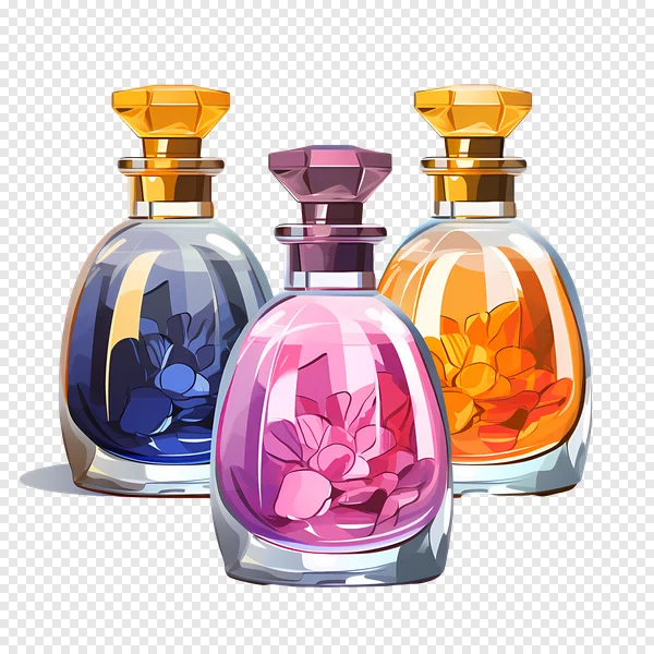 Enhance your design projects with this stunning free PNG download featuring a trio of stylized perfume bottles. Each bottle showcases vibrant liquid – pink, blue, and orange – with delicate floral or petal-like structures inside, suggesting natural essential oils or exquisite fragrances. Complete with shiny gold, faceted caps and a crystal-clear glass appearance, this transparent background graphic is ideal for cosmetic branding, beauty industry content, web design, or adding a touch of luxurious charm to your digital art. Download now and let these beautiful aroma bottles inspire your next creation!