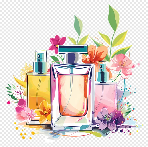 Discover this stunning, high-quality PNG featuring three vibrant perfume bottles surrounded by an array of colorful watercolor flowers and lush green leaves. Each elegant fragrance flacon, in shades of yellow, pink, and red, is beautifully enhanced by artistic splashes and speckles, creating a dynamic and fresh composition. Perfect for beauty blogs, cosmetic marketing, social media graphics, website banners, or any design project needing a touch of floral elegance and sophistication. Download this transparent PNG for free and infuse your designs with a captivating, sweet-scented allure.