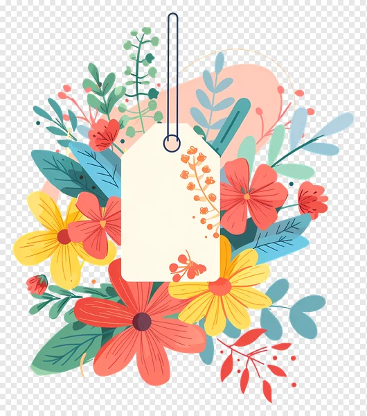 Discover this stunning free Floral Tag PNG, a vibrant and versatile design perfect for adding a touch of nature to your projects. Featuring a blank, elegant tag surrounded by a lush arrangement of colorful flowers in shades of red and yellow, alongside diverse green and blue leaves, and charming abstract botanical elements. This high-quality transparent PNG is ideal for crafting unique price tags, gift labels, sale banners, wedding stationery, social media graphics, or any design needing a fresh, natural frame. Download this beautiful flower border illustration for free and effortlessly enhance your creative work with its aesthetic charm and cheerful spring vibe. Perfect for digital and print media!