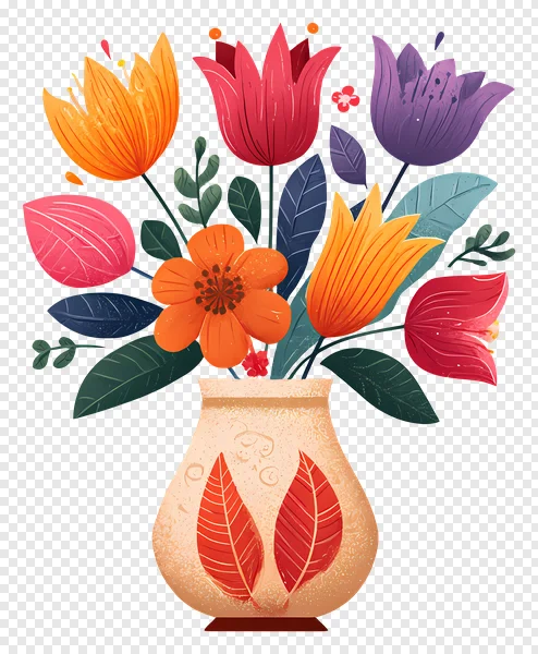 Discover this exquisite free PNG of a vibrant folk art floral bouquet, bursting with color and charm. Featuring stylized orange, red, purple, and pink flowers nestled amongst rich green and blue textured leaves, all elegantly arranged in a decorative, textured beige vase with striking red leaf accents. Perfect for adding a touch of nature and artistic flair to your digital projects, invitations, greeting cards, websites, or personal crafts. Download this high-quality botanical illustration with a transparent background instantly and enhance your creative designs today!