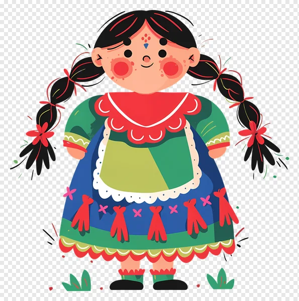 Discover this enchanting free PNG of a cute cartoon girl, beautifully illustrated in a vibrant traditional folk dress. This adorable character features dark braided pigtails adorned with red flowers, rosy cheeks, and a warm, friendly smile. Her colorful attire includes a bright red scarf, a green top, and a blue apron-style skirt detailed with decorative red ribbons and a whimsical scalloped trim, making her perfect for projects celebrating diversity and culture. Ideal for children's books, educational materials, website graphics, or any design needing a cheerful and inclusive touch. Download this high-quality illustration with a transparent background for your creative endeavors today and add a touch of global charm to your designs!