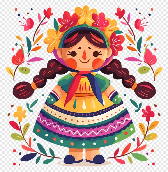 Tags: Cinco de Mayo Mexican doll braided pigtails bright colors cheerful girl children's illustration colorful illustration cultural design cute character digital art ethnic art festive graphic fiesta floral elements flower crown folk art girl free PNG download traditional doll transparent background vibrant art