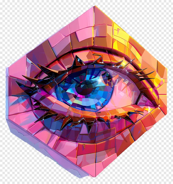 Discover this captivating free PNG download featuring a vibrant geometric crystal eye. This stunning digital art piece showcases intricate faceted details in brilliant pink, blue, orange, and purple hues, reflecting light like a precious gem. Perfect for adding a futuristic or artistic touch to your graphic design projects, presentations, or website. With its transparent background, this high-quality abstract eye PNG is ready to elevate your creative work. Download now and bring a touch of dazzling mystery to your designs!