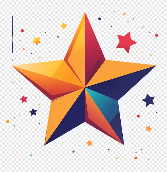 Download this eye-catching, free PNG of a vibrant geometric star icon, perfect for adding a pop of color to your projects! Featuring a multi-faceted design with shades of orange, red, and blue, highlighted by a clean white outline, this abstract star shines against a sparkling black background adorned with smaller colorful stars and dots. Ideal for web design, presentations, awards, ratings, or any creative endeavor needing a touch of modern brilliance. Get this high-quality, transparent PNG graphic today for personal and commercial use!